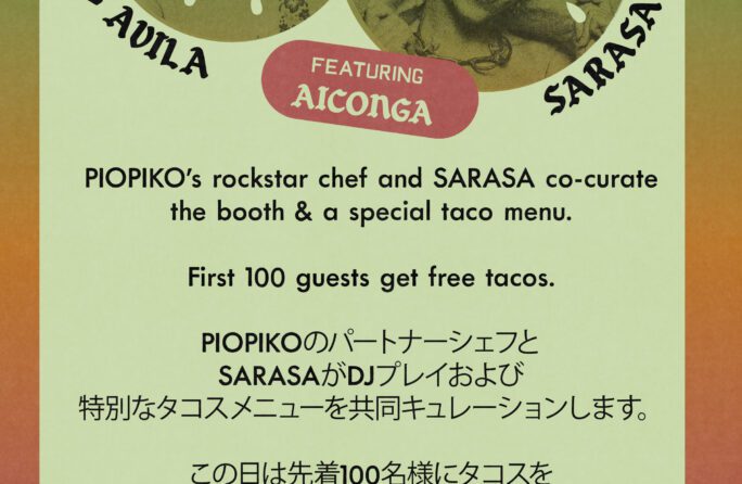 To coincide with the Japan visit of chef Wes Avila, a leading figure in Los Angeles taco culture, PIOPIKO presents a special one-night-only event. PIOPIKO teams up with CASA DE SARASA, led by DJ SARASA, for an exclusive collaboration event: “PIOPIKO & CASA DE SARASA Team-up Tacos.”