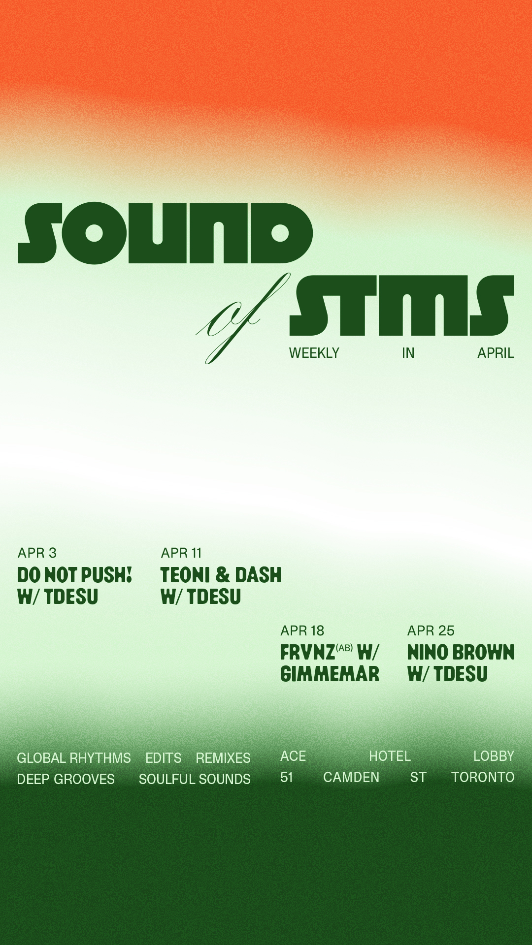 “Sound of Stms” invites a different guest DJ each week alongside organizer Tdesu —for a free evening of soulful sonics at Ace Hotel Toronto ranging from global sounds to remixes, r&b, edits and beyond.